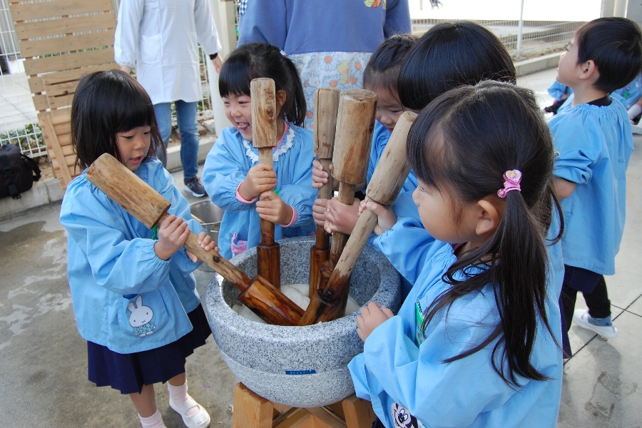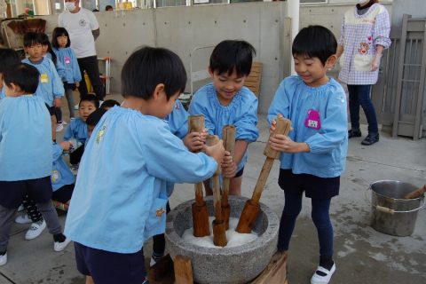 「よいしょ!よいしょ!」の掛け声に合わせて、クラスごとにもちつきを体験した子どもたち。杵(きね)や臼(うす)などの道具の名前やもち米がおもちになる過程など、日本の伝統行事にふれながらたくさんのことを学んでいる様子でした。