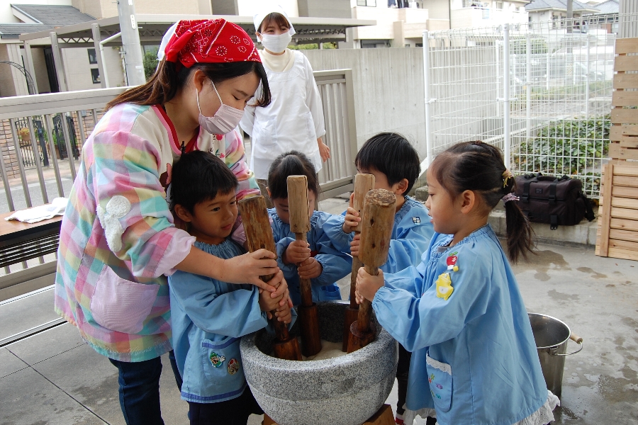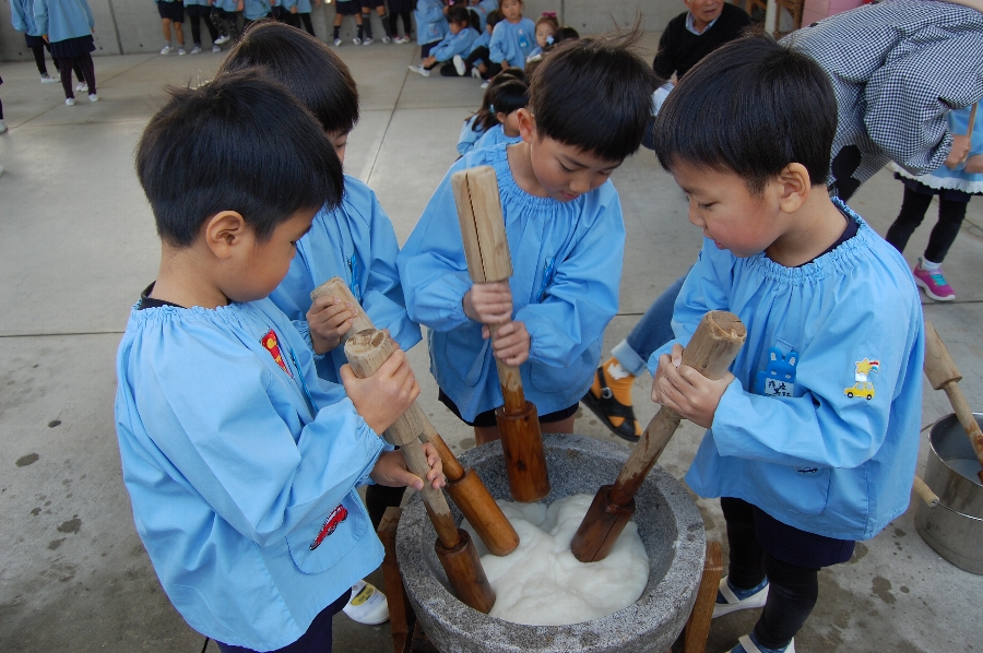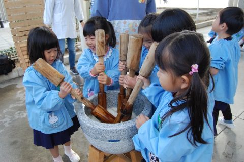 12月16日(月)、愛知学泉大学附属幼稚園でもちつきをしました。今年も教育後援会の役員をはじめとする保護者のみなさまにご協力いただき、大人も子どもも楽しいもちつきとなりました。