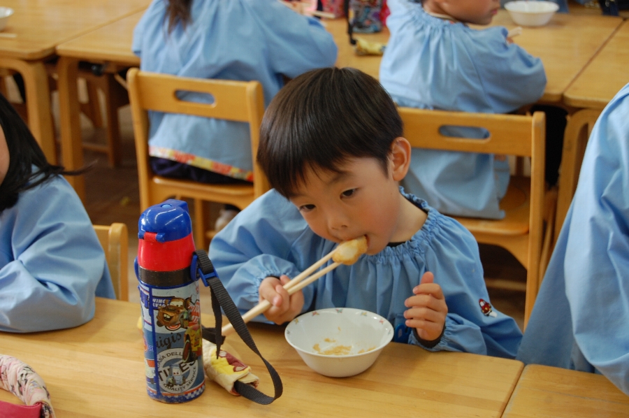 教室ではつきたてのおもちをきなこもちにして食べました。「そのくらいにしないとお弁当食べられないよ」と先生に言われるほど、子どもたちはたくさん食べてくれました!