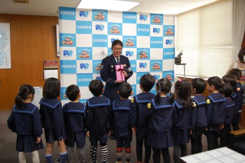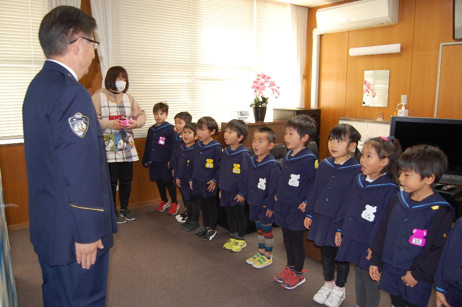 午後は年長さんがおもちを持って安城市の警察署と消防署を訪問。「お仕事頑張ってください!」と日頃の感謝の気持ちを伝えて、みんなでおもちを贈呈しました。署長さんの「ありがとう。これを食べてお仕事頑張ります」の言葉に嬉しそうな表情を浮かべていました。